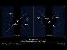 Kerberos was discovered by researchers of the Pluto Companion Search Team using the Hubble Space Telescope on 28 June 2011, using the Wide Field Camera 3, during an attempt to find any rings that Pluto might possess.[11][12] The search for rings was motivated in part by a desire to avoid damage to New Horizons when it passed through the Pluto system in July 2015.[13] Further observations were made on 3 and 18 July 2011 and Kerberos was verified as a new moon on 20 July 2011.[1][14] It was later precovered or identified in earlier archival Hubble images from 15 February 2006 and 25 June 2010, though Kerberos was obscured by diffraction spikes in those images.[15] Kerberos's brightness is only about 10% of that of Nix, and it was only found because the discovery team took eight-minute exposures; earlier observations had used shorter exposures.[16] It was officially designated S/2011 (134340) 1,[1] and was informally referred to as P4.[16]