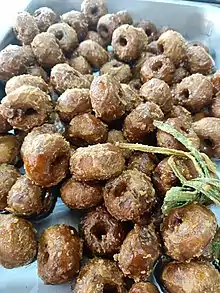 Keria Gula Melaka is a type of doughnuts that made of sweet potato and slicked with smoky gula Melaka, Malaysian palm sugar.[1]