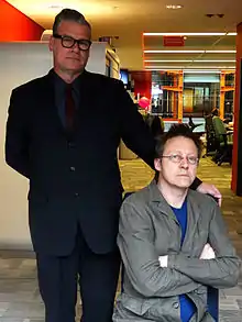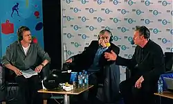 ![]() Mayo (left) and Kermode (right) broadcasting live from Edinburgh in June 2009, with guest Bill Forsyth. | |