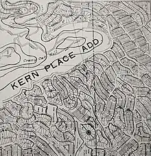 In 1913, a paved road was created on Mesa Avenue and leading to the area known as Kern Place.[5] Kern had an engineer, W.I. Rider, help him develop plans for the neighborhood.[6] Construction began on November 21, 1914.[7] A 1914 ad in the El Paso Herald described horse trails, planned parks, homes for sale under $3,500 and access to public transportation.[8] Kern named the streets after friends and for places he "admired."[9] Kern also did not want commercial properties on his land.[9] Kern borrowed the money to develop the property from Texas Bank & Trust which later merged with First National Bank.[10] In 1915, Kern had 500 trees planted in Madeline Park,[11] located in Kern Place, which he gave to the city of El Paso later that same year.[12] On May 4, 1926, Kern sold the land that made up Kern place.[13][14]