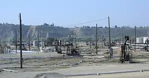 The Kern River Oil Field is a large oil field in Kern County in the San Joaquin Valley of California, north-northeast of Bakersfield in the lower Sierra foothills. Yielding a cumulative production of close to 2 billion barrels (320,000,000 m3) of oil by the end of 2006, it is the third largest oil field in California, after the Midway-Sunset Oil Field and the Wilmington Oil Field, and the fifth largest in the United States.[1] Its estimated remaining reserves, as of the end of 2006, were around 476 million barrels (75,700,000 m3), the second largest in the state. It had 9,183 active wells, the second highest in the state.[2] The principal operator on the field is Chevron Corporation[3]