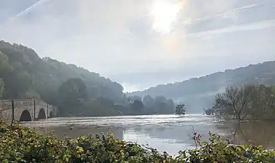 It was the only bridge built over the River Wye to accommodate barge traffic,[34] and to aid this traffic Jones built a stone-slab towpath, 5 feet (1.5 metres) wide, through the arch nearest the right bank. At the upstream end of the towpath the remains of a small barge wharf can be seen, though it is uncertain if this was built at the same time.