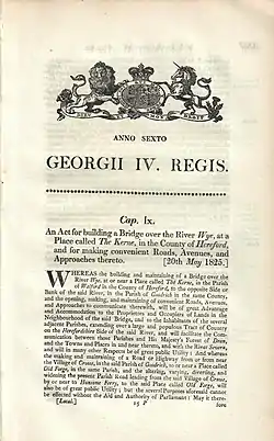 - An Act for building a Bridge over the River Wye, at a Place called The Kerne ..., Anno Sexto, Georgii IV. Regis, Houses of Parliament, London, 20 May 1825