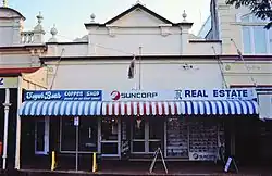The rendered street facade is surmounted by a parapet with a heavy cornice and raised central pediment, supporting three urns, with EST 1902 in relief. The two shop fronts have face brick with aluminium framed glazing, with a recessed entry to the west tenancy and central corridor. An aluminium awning is slung from the facade replacing an earlier ogee awning on timber posts.[1]