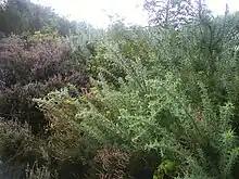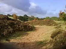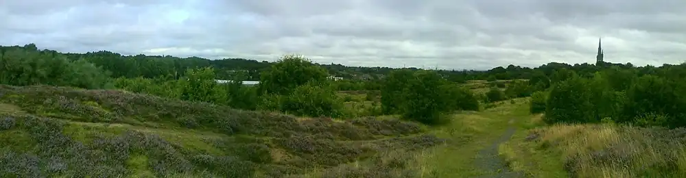 Kersal Moor is one of the many fluvioglacial ridges that formed along the Irwell Valley during the melting of the glaciers at the end of the last ice age.[6] Typically for this type of landform, the subsoil is composed of sand mixed with coarse gravel. The 19th century botanist Richard Buxton described this as "Mr. E.W. Binney's drift deposit no.2 ... a deposit of sharp forest sand, parted with layers of gravel composed of Azoic, Palaeozoic and Triassic rocks, well rounded, parted with layers of fine sand, and having every appearance of a regular deposit by water."[nb 1][7] This deposit is overlaid with a thin topsoil supporting a range of mosses, heathers, grasses, ferns,[8] common broom, gorse and some trees, which are predominantly oak with some rowan, cherry and other broadleaved species. The land to the south is elevated, rising to a high point towards the south-west. From this elevated position there are views across Manchester to the Derbyshire hills in the south, to the Pennines in the north east and across the Irwell Valley and Salford in the west. The land falls away to the north, ending with two drumlin-shaped hills on the northern edge, which were probably formed by sediment from the meltwater of the receding glaciers, in a process known as sedimentary fluting. The moor is criss-crossed with footpaths, many of which cut through to the sand and gravel below. Singleton Brook, to the north of the moor, denotes the boundary between Salford and Prestwich.