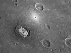 Located in the western edge of Mercury's giant Caloris basin, Kertész crater (named in 2008 for André Kertész, a Hungarian-born American photographer)[1] has some unusual, bright material located on its floor. Sander crater, located in the northwestern edge of Caloris basin, also shows bright material on its floor. Just northeast of Kertész a small crater has very bright rays and ejecta, indicating that the crater is young.[2]