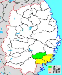 colored area=original extent in Meiji period; green=present area