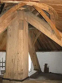 Keston Mill has a three-storey body on a single-storey roundhouse. The roundhouse enclosed the trestle and the date 1716 is carved on the main post. It had four double Patent sails carried on a cast-iron windshaft. The mill is winded by a tailpole. The wooden brake wheel drives a cast-iron wallower, which drives a cast-iron great spur wheel with wooden cogs. This drives two pairs of underdrift millstones in the breast of the mill. The mill also has a flour dresser (bolter).[2] The bolter in Keston mill has been used as the model for a reconstructed bolter in Lowfield Heath Windmill, Charlwood, Surrey.[6]