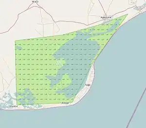 There is large salt production in some parts of the lagoon at specific times.[42] Producing salt from the saline waters of the Keta Lagoon were unknown until 1702 because the people did not have the technology to do it.[43] Salt production has gradually developed among the people. During the harmartan season of November to February, the shallower parts of the lagoon close to Adina, Afiadenyigba and Anyako get evaporated especially during years when the rainfall is low. Salt crystal form from the sodium chloride which is available naturally in the area. The men make enclosures around the salty water to stop any fresh water from flowing into it. These crystals grow larger and are then mined or collected mostly by the women. Investors buy the salt and store it for sale when the prices are increased. This natural resource brings a lot of revenue to the people. However, in December 2013, 600 residents from Agbozume, at the eastern end of the lagoon, took part in a protest against the Kensington Salt Factory, who they claimed had endangered their livelihoods by creating a crater to remove sand to build a road. This, they said had damaged the banks of the lagoon and created the threat of flooding.[44] However, the chiefs of Adina contested the validity of the Agbozome protestors, ane explained that they had the authority to grant permission for Kensington Industries Limited to exploit this resource.[45]