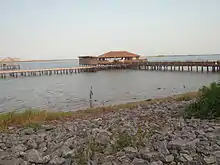 There is constant flooding of the area after heavy rains and also from the inflow of Kplikpa and Aka rivers into the lagoon.[20] The colonial government began to record the high water levels at Keta from 1907 onwards,[21] but for a long time they did not do much because of the opinion that the merchants and inhabitants should also invest in saving their own town and businesses. The foreign merchants and people of Keta believed that the colonial government should be responsible in saving the land. This issue has defined the political history of the Anlo - Ewe politicians. In periods of flooding, entire settlements would move out of their homes. To stop the flooding and the coastal erosion attempts were made during the colonial period without success. In 1963, Aryee, an officer in charge of the Public Works Department at the Keta District took the initiative and cut a canal from the lagoon to the sea.[22] This was known as Aryee Canal. He and the ground on which he was standing was swept away by a huge flood and it turned out that his plan had done more harm than good. The problem of flooding has now abated because of increased climate change and reduction in rainfall. The Keta Sea Defence project has created a canal between the lagoon and the sea so that over flooded water can go through the canal into the sea. A road was constructed through the lagoon from Kedzi to Metsrikasa for the transportation of the boulder rocks used for the construction work. Since there is no bridge for the water to flow through, the road created shallow waters to the eastern part of the lagoon.