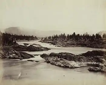 Kettle Falls (Salish: Shonitkwu, meaning "roaring or noisy waters",[1] also Schwenetekoo translated as "Keep Sounding Water"[2]) was an ancient and important salmon fishing site on the upper reaches of the Columbia River, in what is today the U.S. state of Washington, near the Canada–US border. The falls consisted of a series of rapids and cascades where the river passed through quartzite rocks deposited by prehistoric floods on a substrate of Columbia River basalt. The river dropped nearly 50 feet (15 m), and the sound of the falls could be heard for miles away.[1] Kettle Falls was inundated in 1940, as the waters of the reservoir Lake Roosevelt rose behind Grand Coulee Dam, permanently flooding the site.[1]