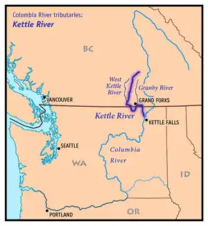 The Kettle River is a 281-kilometre (175 mi) tributary of the Columbia River, encompassing a 10,877-square-kilometre (4,200 sq mi) drainage basin, of which 8,228 square kilometres (3,177 sq mi) are in southern British Columbia, Canada and 2,649 square kilometres (1,023 sq mi) in northeastern Washington, US.[4]