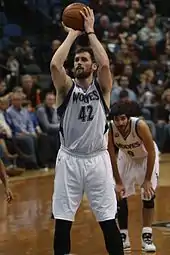 Love led the NBA in rebounding, averaging 15.2 per game.[61] He won the NBA Most Improved Player Award after increasing his points per game by 44 percent and his rebounds per game by 38 percent over his previous season. Love established career highs in rebounding, scoring (20.2), assists (2.5), double-doubles (64), field goal percentage (.470), free throw shooting (.850), and minutes played (35.8). He became the first player to average at least 20 points and 15 rebounds in a season since Malone in the 1982–83 season.[63] While amassing double-doubles, a statistical hallmark of traditional power forwards, Love was also evolving into a stretch four, making a career-high 41.7 percent of his 3's, while upping his three-point attempts to almost three per game.[63][64] He emerged as the new face of the franchise since Garnett was traded from the Timberwolves to the Boston Celtics in 2007.[65] In 2010–11, Love's No. 42 was the Wolves' top-selling jersey; sales were comparable to Kevin Garnett's when he was in his prime.[66]