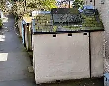 The Kew Mortuary or Dead-House is a small, shed-like building, approximately 3.75 by 2.25 metres (12.3 ft × 7.4 ft) and 2.8 metres (9 ft 2 in) high, attached to the back of Caxton House, 110 Kew Green (TW9 3AR), just to the east of Kew Bridge on Greyhound Lane facing Westerley Ware. This Victorian mortuary building retains an original slate slab.