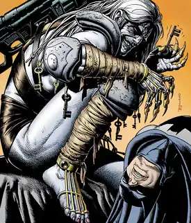 The Key next appears in Gotham City, where he uses his psycho-chemicals to remove Batman's inhibition against killing. The Key's goal is to have Batman kill him, so that he might unlock the secret of death. Batgirl and Azrael must prevent Batman from committing murder until the drug wears off.[6] The Key makes an appearance, along with a large group of villains, attacking the Justice League and Marvel Comics' the Avengers in 2003.[7]