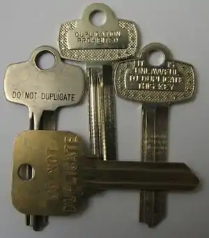 In many territories, keys stamped with "Do not duplicate" or "It is unlawful to duplicate this key" are protected from unauthorised duplication by patent or registered design and the dealers (often locksmiths) being conditionally licensed to distribute the keys by the owner of the design (the manufacturer).[1] Once a patented or registered design has expired, it is no longer legally protected from unauthorised duplication, however the license agreement may continue to restrict the distributor, and some trade organisations have ethical standards that prevent members from duplicating such keys.[2] In other territories, they are perfectly legal to duplicate.[3] Some key blank manufacturers strictly restrict the sale of their own blanks. Some blanks are made only in small volumes and are not widely available.