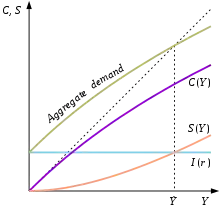 The horizontal blue line I (r ) is the schedule of the marginal efficiency of capital whose value is independent of Y. The schedule of the marginal efficiency of capital is dependent on the interest rate, specifically the interest rate cost of a new investment. If the interest rate charged by the financial sector to the productive sector is below the marginal efficiency of capital at that level of technology and capital intensity then investment is positive and grows the lower the interest rate is, given the diminishing return of capital. If the interest rate is above the marginal efficiency of capital then investment is equal to zero. Keynes interprets this as the demand for investment and denotes the sum of demands for consumption and investment as "aggregate demand", plotted as a separate curve. Aggregate demand must equal total income, so equilibrium income must be determined by the point where the aggregate demand curve crosses the 45° line.[63] This is the same horizontal position as the intersection of I (r ) with S (Y ).