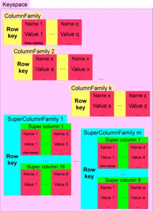 The keyspace has similar importance like a schema has in a database. In contrast to the schema, however, it does not stipulate any concrete structure, like it is known in the entity-relationship model used widely in the relational data models. For instance, the contents of the keyspace can be column families, each having different number of columns, or even different columns. So, the column families that somehow relate to the row concept in relational databases do not stipulate any fixed structure. The only point that is the same with a schema is that it also contains a number of "objects", which are tables in RDBMS systems and here column families or super columns.