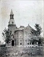In February 1866, a contract was awarded for construction of a replacement courthouse, a two-story brick building with cupola. Built at a cost of $40,000, it would serve the county until it was destroyed by fire on August 27, 1973.[13] By the mid-1890s, Keytesville had an estimated population of about 1,100 citizens and two newspapers, the Chariton Courier and Keytesville Signal. Businesses included the Keytesville Roller Mill, a large water-powered grist mill on Mussel Fork Creek; two banks; a building and loan association; two hotels; a distillery; general mercantiles; and restaurants.[7][8] Because of the town's location 1.5 mi (2.4 km) north of the Wabash Railroad line, Keytesville merchants encouraged the construction, in 1889, of a streetcar line. Hugo Bartz and J. J. Moore, secured land and financing for the project, which when completed consisted of two miles of track and a large barn for horses and rolling stock, constructed for a cost of $10,000.[7] Two horse-drawn passenger coaches and a large flatcar for freight delivered new arrivals at the Wabash depot to the town.