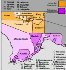 - Tshabong has the following villages: Bogogobo, Bokspits, Bray, Gachibana, Khisa, Khuis, Khwawa, Kokotsha, Kolonkwane, Makopong, Maleshe, Maralaleng, Maubelo, Middlepits, Omaweneno, Phepheng (Draaihoek), Rapples Pan, Struizendam, Tsabong, Vaalhoek, Werda.[10]