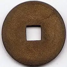 The Khải Định Thông Bảo (Hán tự: 啓定通寳;[lower-alpha 1] French: Sapèque Khaï-Dinh) was a French Indochinese sapèque coin produced from 1921 until 1933, the design of the coin was round with a square hole that was used for stringing them together. Khải Định became Emperor of Annam in 1916 the funding for the production of new cash coins was reduced by the Hanoi Mint which lead to the demand of the Vietnamese market for low value denominations to not be met, furthermore, after Hanoi reduced funding for the Thanh Hóa Mint, which until that time was producing enough low denomination cast cash coins to meet the market's demands, which caused most, but not all, of the production of cash coins at the mint to cease in 1920.[1] In response a new committee was formed in Hanoi which ordered the creation of machine-struck Khải Định Thông Bảo cash coins, these are the first machine-struck four character Thông Bảo (通寳) coins in Vietnam with the reigning emperor's name as the French government had prior tried to introduce a Cochinchinese 2 sapèque coin that continued under French Indochina that weighed 2.05 grams and had a nominal value of 1⁄500 piastre, later the colonial government of the French Protectorate of Tonkin had unsuccessfully tried to introduce a zinc milled sapèque produced by the Paris Mint with a nominal value of 1⁄600 piastre from 1905 until 1906. Unlike the earlier attempts at producing machine-struck cash coins by the colonial French authorities the Khải Định Thông Bảo proved to be much more successful as the first series had a production of 27,629,000 coins while the second series greatly exceeded this with around 200,000,000 coins produced in Huế, Haiphong, and Hanoi.[4][5] The Khải Định Thông Bảo continued to be produced long after the death of Emperor Khải Định under his successor Bảo Đại until it was phased out by the Bảo Đại Thông Bảo (保大通寳) in 1933.[6][7]
