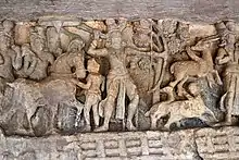 Ganesha Gumpha is one of the most important caves in Udayagiri. The cave is named for the carved figure of Ganesha on the back of its right cell. Of course, it would have been carved in the later period and it cannot be the original work. The cave has two large statues of elephants carrying garlands at the entrance and is the first example of sculpture animals used as a guard to the entrance.[12] Also, the carved figures of dwara palas are found at the entrances. The carvings in this cave narrate the story of the elopement of Bassavadatta, Princess of Ujjayini, with King Udayana of Kausambi in the company of Vasantaka.[12]