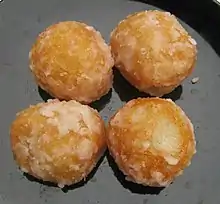 Khanom khai hong is fried dessert balls made of flour stuffed with seasoning mung bean, before being deep-fried and coated with icing or white sesame seeds. Its taste is sweet, salty; crispy outside, but soft inside.
