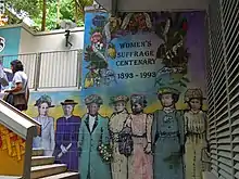 In 1993, in honour of the centenary of women's suffrage in New Zealand, a painted 2000–tile memorial and waterfall dedicated to Auckland's and New Zealand women's suffrage movement was installed in the stairway.[1] The artist Claudia Pond Eyley and ceramicist Jan Morrison choose the Auckland-based suffragists depicted in the memorial. The women featured in the lower and main section include (from left):