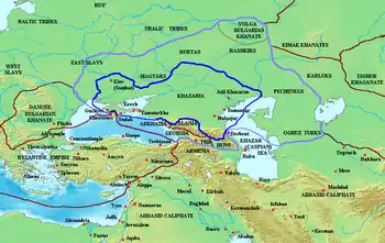 The Qağanate of the Khazars thus took shape out of the ruins of this nomadic empire as it broke up under pressure from the Tang dynasty armies to the east sometime between 630 and 650.[51] After their conquest of the lower Volga region to the East and an area westwards between the Danube and the Dniepr, and their subjugation of the Onoğur-Bulğar union, sometime around 670, a properly constituted Khazar Qağanate emerges,[58] becoming the westernmost successor state of the formidable Göktürk Qağanate after its disintegration. According to Omeljan Pritsak, the language of the Onoğur-Bulğar federation was to become the lingua franca of Khazaria[59] as it developed into what Lev Gumilev called a "steppe Atlantis" (stepnaja Atlantida/ Степная Атлантида).[60] Historians have often referred to this period of Khazar domination as the Pax Khazarica since the state became an international trading hub permitting Western Eurasian merchants safe transit across it to pursue their business without interference.[61] The high status soon to be accorded this empire to the north is attested by Ibn al-Balḫî's Fârsnâma (c. 1100), which relates that the Sasanian Shah, Ḫusraw 1, Anûsîrvân, placed three thrones by his own, one for the King of China, a second for the King of Byzantium, and a third for the king of the Khazars. Although anachronistic in retrodating the Khazars to this period, the legend, in placing the Khazar qağan on a throne with equal status to kings of the other two superpowers, bears witness to the reputation won by the Khazars from early times.[62][63]