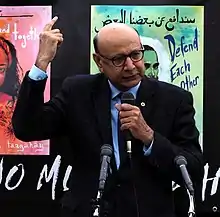 Muslim American women took to social media with the hashtag "#CanYouHearUsNow" to protest Trump's comments.[52] The organization Veterans of Foreign Wars issued a statement saying, "Election year or not, the VFW will not tolerate anyone berating a Gold Star family member for exercising his or her right of speech or expression."[53][54] Paul Rieckhoff of the Iraq and Afghanistan Veterans of America said that Trump's comparison of his own sacrifice to families who lost family members in war was "insulting, foolish and ignorant."[21] The Jewish War Veterans of the United States said that Trump was worthy of "contempt" and said that his remarks on Ghazala Khan were "vile beyond words."[55] An open letter by 23 Gold Star families called upon Trump to apologize to the Khans.[56][57][58]