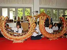 The instrument's wooden frame is made of beechwood (Gmelina arborea), with rattan used to suspend the individual gongs.[2] The wooden frame is embellished with traditional arabesque or kanok designs, inlaid with glass mosaic, and carvings depicting a stylized kinnari bird or devas.[2][3] The image of a half-man, half-bird figure carved onto the frame is traditional, and is meant to symbolize a celestial musician. The frame is also typically decorated lavishly in gold paint and glass mosaic. Khong mon are featured in a special type of Thai ensemble called pi phat, which plays pi phat mon or pi phat nang hong into the mainstream of traditional Thai music as well; pi phat mon or pi phat nang hong is usually performed by Thai musicians.