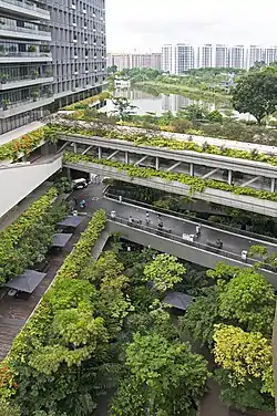 "Fins" along the building's walls are designed to channel the prevailing north-east winds into the building. Wind tunnel tests conducted at the National University of Singapore found that the "fins" would enhance the air flow by 20 to 30%.[11] Sun shades are placed over the windows to reduce direct glare from sunlight and also directed upwards towards the ceiling to light up the wards.[9] This reduces energy use on lighting up the hospital.[9] Solar panels on the roof provide power to fans in the public areas.[9] The air-conditioning system draws supply air from its internal courtyards, where the air is cooler, hence reducing the cooling loads.