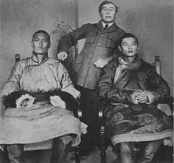 Choibalsan was born on 8 February 1895 in Achit Beysiyn, near present-day Choibalsan, Dornod Province.[2] He was the youngest of four children born to a poor unmarried herdswoman named Khorloo (the name Khorloogiin is a matronymic). His father was likely a Barga tribes man, Daur Mongol from Inner Mongolia called Jamsu, but Choibalsan claimed to be unaware of his identity.[3] Named Dugar at birth, he assumed the religious name Choibalsan at age 13 after entering the local Buddhist monastery of San Beysiyn Khüree[4] where he trained to be a Lamaist monk. Five years later he fled to Khüree (also known as Urga—present-day Ulaanbaatar) with another novice where he worked odd jobs. In part to prevent him from being returned to the monastery, a sympathetic Buryat teacher named Nikolai Danchinov had him enrolled in the Russian consulate's Russian-Mongolian Translators' School.[5] A year later he was sent on at public expense to study at a gymnasium in Irkutsk, Russia from 1914 to 1917.