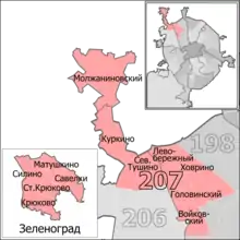 | Districts | Zelenogradsky AO, Northern AO (Golovinsky, Khovrino, Levoberezhny, Molzhaninovsky, Voykovsky), North-Western AO (Kurkino, Severnoye Tushino) |