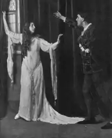 St. Albans appeared in two shows on Broadway; she played Juliet opposite George Relph's Romeo in a 1915 production of Romeo and Juliet,[6] and she played a dancer in Ruth Sawyer's The Awakening (1918), costarring with Theodore Kosloff.[7] Neither show was well-reviewed; the New York Times called The Awakening "a weird and very artificial play" "almost unbelievably crude and old-fashioned."[8] Metcalfe, a writer in Life, mused that "Someday, perhaps, we shall have a Society for the Prevention of Ladies Who Think They Can Act, but Can't, [and] a League for the Suppression of Persons Who Write Plays But Shouldn't. Had either of these organizations been in successful existence we should never have had 'The Awakening' with Khyva St. Albans."[9] Of her Juliet, Heywood Broun in the New York Tribune wrote that "there was no passion in the performance of Miss St. Albans. She was a Juliet of the sort who would have suggested a long engagement, deferring marriage until such time as she had finished her schooling and Romeo had a steady job".[10]