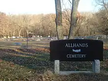 Europeans were drawn to what is now the Kickapoo State Recreation Area with the discovery of salt springs in 1819.[1] Most of the immigrants to this area were English.[3] After the Europeans settled in the area, they began to dig wells all over the land. From these wells they harvested salt brine and boiled it down to produce salt. This salt operation continued until 1848, producing as much as 120 bushels of salt per week during the peak of its production process.[1] One of the iron rendering kettles used in the production process can be seen at the Salt Kettle Rest area on I-74.[2] Many European settlers from the early 20th century are buried in Allhands Cemetery, which is located in the eastern section of the park. Other settlers such as John Cox, an Indian fighter and scout in the Black Hawk War,[2] and his wife are buried at the entrance to Fox Campground in a small pioneer cemetery.