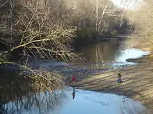 For boating activities, there are 12 launching ramps on 9 of the lakes in Kickapoo State Park although only electric motors are allowed on these lakes.[1] Kickapoo Adventures, previously known as Kickapoo Landing, is a concession place within the park offering canoe, paddle board, tube, and kayak rentals, shuttle services to parts of the Middle Fork of the Vermilion River, bait, firewood, and a restaurant for visitors to enjoy.[11] Visitors may rent boats by the hour for use on Clear Lake within the park, or sign up for a trip down the Middle Fork of the Vermilion River with a canoe, kayak, or inner tube. The tube trip is 2 miles long starting at Sportsman's Lake and ending in the state park. For visitors wishing to partake in kayaking or canoeing activities down the river they may choose between a 13-mile trip beginning at Kinny's Ford, an 8-mile trip starting at Bunker Hill, or a combination of 2 miles on the Vermilion River and paddling through 3 lakes in the park.[11] In addition to rental services, Kickapoo Adventures sells fishing licenses, tackle, and an assortment of worms for bait. The concession also has live music at the dockside cafe Tuesday and Friday nights all summer long.[11]