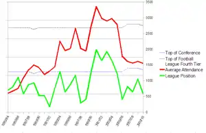 | 2008–09 | Conference National | 5 | 46 | 23 | 10 | 13 | 69 | 48 | +21 | 79 | 6th of 24 | Matthew Barnes-Homer | 20 | R3 | - | R3 | 1,684[67] |