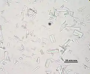 Calcium oxalate crystals can come in two varieties. Calcium oxalate monohydrate can appear as 'dumbbells' or as long ovals that resemble the individual posts in a picket fence. Calcium oxalate dihydrate have a tetragonal “envelope” appearance.[73]