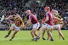 ![]() Kieran Joyce (first from left) in action for Kilkenny against James Regan and Cathal Mannion for Galway in the 2015 National Hurling League at Pearse Stadium | |||