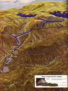 By 1945 only a small part of the scheme was complete, and power demand had risen during war. The SECV re-examined the scheme from 1947, and in 1948 an augmented program of work was approved.[3] The size of the main reservoirs was expanded, and the catchment area was increased though the use of open aqueducts. Generation capacity was also increased, with a maximum output of 289 megawatts, double that of the 1937 scheme. The cost was to be $50.4 million[2] (or 25.27 million pounds[5]), and the generators would be located in a series of underground power stations, the first such installations in Australia.[6] The town of Bogong was too restricted as a base camp, and the town of Mount Beauty was established at the foot of the mountains. The railhead for materials was moved to Bandiana, and the Kiewa Valley Highway was sealed and realigned for 50 miles (80 km) to Mount Beauty.