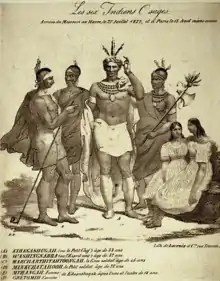 Kihegashugah was in his late 30s when he made a long journey to France along with his two wives, Hawk Woman and Sacred Sun, Frenchman David DeLaunay, and four other Osage Indians in 1827. They faced many hardships on the way to France and when in France.[1] The Osage were led to believe that they were traveling with DeLaunay to Washington, D.C. to meet the president. However, DeLaunay actually took them to France and the Netherlands where he displayed them in a Wild West show for European entertainment.[2] While in France Little Chief and his band met King Charles. While there Little Chief took a ride in a hot air balloon. The hot air balloon was a recent invention of the French Montgofier brothers, and a popular attraction in France during the period.[3]
