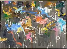 A commonality in the entire body of Saito's work, both on stage or on canvas, focuses on written signs. Repeated investigations of alphabet in Saito's work, both real and made-up, legible and obscured, speak to moments in his personal history.[4] As a young immigrant in a country whose language he did not speak, Saito wrote space for himself in the already-established Color Field tradition by constructing his own painterly lexicon. Opposing motifs of free gestural brushstrokes and elegant, ordered lettering allude again to his double practice as painter and architect of poetic performance. Abstraction in Saito's work points to a meditation on the instabilities and impermanence of language and the mutability of meaning. A space opens once departing from structuralist systems of transmuting signs, and Saito fills that space with vibrant color.