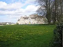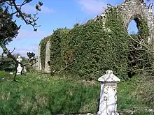 St Bécán, one of the 'Twelve Apostles of Ireland', founded a monastery here in the 6th century, giving rise to the town's Irish name Cill Bheagáin, meaning "the church of St Bécán".[2] In time the monastery fell into disuse and disrepair. A new monastery was founded on the site in 1150, by a member of the Mac Loghlan family, the ruins of the previous one having been rebuilt by the Dalton family. It was subsequently home to Cistercian monks from Mellifont Abbey. The great priest of Clonmacnois, O'Catharnaigh (O'Kearney), died at the monastery in 1196 and Hugh O'Malone, Bishop of Clonmacnois, was buried there in 1236. In 1217 the monastery was involved in the riot of Jerpoint, and the abbot was punished as a result. Following the Conspiracy of Mellifont, the monastery was made subject to Buildwas Abbey. After its dissolution in 1539, the monastery and its extensive lands were granted to the Lambart family. The monastery was subsequently totally demolished and its location was lost. However, the location and full plan of the monastery were uncovered by geophysical survey by Archaeological Projects in 2003 west of the early-medieval graveyard (Hayden 2003). A later parish church was built northeast of the early medieval church and served as the parish church for the reformed Church of Ireland.[4][5] The church is no longer in use. The tower survives, in a ruinous state.