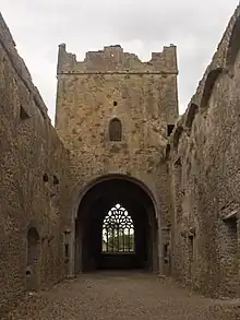 The main part of the abbey consists of the entrance chamber, the church, the tower, and the sacristy. The entrance chamber has a carved baptismal font on its south wall. The nave of the church is still roofed, but the rest of it is out in the open. The church has two large carved windows on its east and west side. The chancel contains two stone tombs and a stone altar. One of these tombs is that of the knight Piers Fitz Oge Butler.[2] His tomb records his death as taking place in 1526,[3] and has some carvings of 10 apostles on the side of it carved by Rory O Tunney, who is also noted for his work in Jerpoint Abbey. On top of the Butler tomb, there is the effigy of a knight with a dog curled up at his feet. The sacristy is entered through a carved archway that has many carvings, such as a scene depicting the crucifixion and a mermaid holding a mirror, which was meant to depict vanity. Roger Stalley suspects this screen wall may represent the entrance to a private Butler chapel, as two Butler shields are depicted. The east end of the nave contains seats for the officiating clergy which have been carved into the crossing piers.