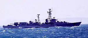 The Kildin-class destroyer was a series of destroyers built for the Soviet Navy in the 1950s. They were a missile armed version of the Kotlin-class destroyer, and the class was named for Kildin Island. Four ships were built around the KSShch (КСЩ, SS-N-1) anti-ship missile. When this missile became obsolete in the 1960s, three ships were modernised in 1972-1977. All ships were decommissioned in the late 1980s early 1990s. The Soviet designation was Project 56EM for the prototype (Bedovy), Project 56M for three series ships, and Project 56U for the modernised ships.