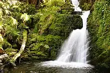 The park is perhaps most famous for its oak woodlands,[3] which are about 12.2 square kilometres (3,000 acres) in size.[13] They form the largest area of native woodland remaining in Ireland and are a remnant of the woodland that once covered much of Ireland. Derrycunihy Wood is perhaps the most natural sessile oak (Quercus petraea) wood in Ireland. Most of the oak woodlands are located on the lower slopes of the Shehy and Tomy mountains, adjacent to Lough Leane. They are typically dominated by sessile oak, which favours the acidic soils of the sandstone mountains.[15] The woods have Annex I status in the EU Habitats Directive because of their diverse and rich flora, most notably their bryophytes (mosses and liverworts).[2]