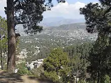 Built in 2004, the three-story[34] compound was at the end of a narrow dirt road.[35] Google Earth maps made from satellite photographs show that the compound was not present in 2001 but had been built by the time that new images were taken in 2005.[36] It is located 4.0 kilometres (2+1⁄2 miles) northeast of the city center of Abbottabad.[32] Abbottabad is about 160 km (100 mi) from the Afghanistan border on the far eastern side of Pakistan (about 30 km or 20 mi from India). The compound is 1.3 km (3⁄4 mi) southwest of the Pakistan Military Academy.[2] Located on a plot of land eight times larger than those of nearby houses, the compound was surrounded by a 3.7-to-5.5-metre (12 to 18 ft)[33] concrete wall topped with barbed wire.[32] It had two security gates, and the third-floor balcony had a 2.1-metre-high (7 ft) privacy wall, tall enough to hide the 1.93 m (6 ft 4 in) bin Laden.