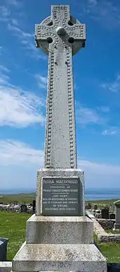 Kilmuir (Scottish Gaelic: Cille Mhoire) is a village on the west coast of the Trotternish peninsula in the north of the island of Skye. It is in the Scottish council area of Highland and is the only place in Scotland (apart from the Western Isles) where Scottish Gaelic is spoken by about half of the population.[1] Flora MacDonald, who assisted Bonnie Prince Charlie to escape from Scotland after his defeat at Culloden, and fashion designer Alexander McQueen are buried in the cemetery here.