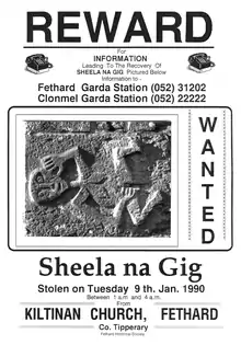 The theft of the Kiltinan sheela-na-gig in the early morning hours of January 9, 1990[5] was discovered by Joe Clarke.[9] Fethard Historical Society in co-operation with photographer Joe Kenny[10] created a Wanted poster,[5] which has unfortunately not led to the recovery of the stone carving as of March 2022. At the time of the theft, the press estimated its worth at £3 million.[9] One of the (since cleared) persons of interest was Jim O'Connor who was a member of Fethard Historical Society and who had grown up in the area of Kiltinan Church.[9] He made a replica of the stolen sheela-na-gig from photographs to replace the stolen one at the church. However, this was never concluded, so the replica is now kept on private land on the Beara Peninsula.[9]